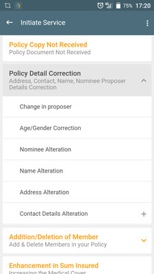 Step 4 - You will see a list of services you can avail on the policy. Say, if you have clicked on health insurance in Step - 3, you can choose from ‘assistance in health check-up’, ‘assistance in renewal’, ‘policy detail correction’, ‘enhancement in sum insured’ and others.